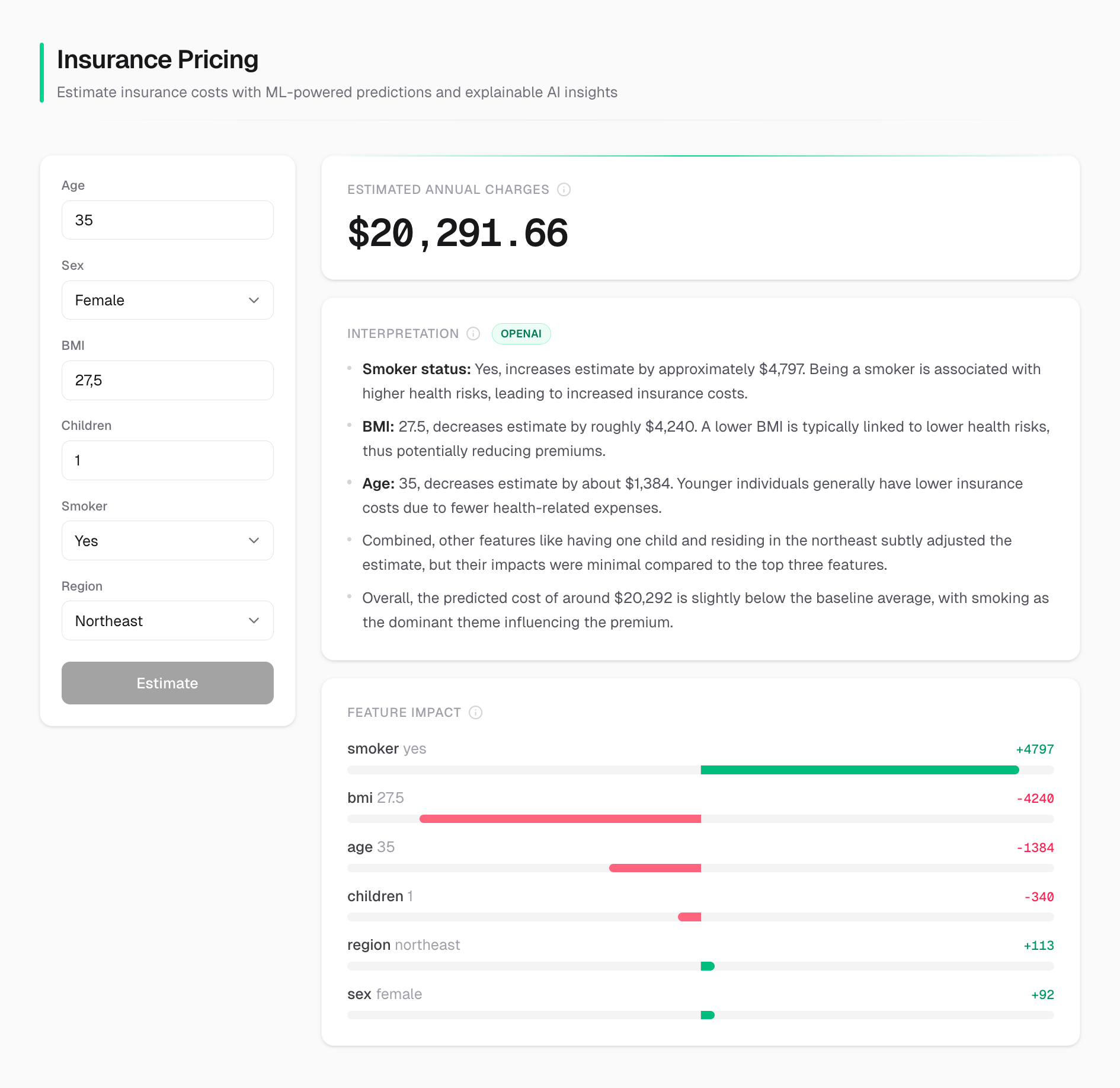 Predictive pricing model that estimates annual insurance charges with transparent SHAP explanations and LLM-powered interpretation of each prediction.